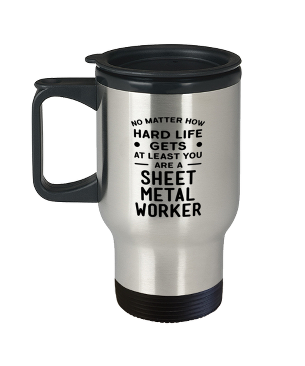 - Sheet metal worker Travel Mug is stylish, can hold 14 oz worth of liquid and come with an easy-to-grip handle. It is sturdy and durable, with tapered bottom that can fit perfectly in a cup holder. It also has slanted drinking surface, making it easy to drink drink whatever content you've got in it.